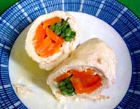 1.ささみは筋を除いて縦に切り目を入れて、観音開きにし、薄くのばす。(塩・こしょう・酒をふる) 2.ニンニクの芽は5cm長さに切る。人参は5mm角の拍子木切りにし、茹でておく。 3.ささみの水気をふいて薄く小麦粉をふり、チーズを置きニンニクの芽と人参を芯にして巻きラップでくるむ。 4.耐熱皿にBを並べて4〜5分電子レンジにかける。 5.食べやすく切って器にもり、おろし生姜を添える。 |