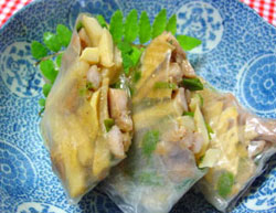 1.筍も鶏肉も細切りにする。ねぎは小口切り。 2.フライパンに油をひき、鶏肉を炒め、肉色が変わったら筍も入れて炒め、調味料で味付けをし、ねぎも入れる。 3.ライスペーパーを水でぬらし、まな板の上に置き、Aの具を包んで巻く。 (5月9日) |