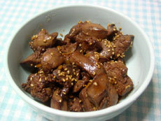 | 鶏レバー・・・200g 生姜・・・1片 いりゴマ・・・適宜 醤油・・・大2 砂糖・・・大1 味醂・酒・・・各大3 |