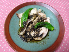 1.ささみもエリンギも細く切っておく。 2.フライパンにささみを並べて、塩・こしょうをする。そして、酒大さじ1・水大さじ4を入れて、ほぐしてから火にかける。蓋をして蒸し煮にする。そこにエリンギ・ししとうも入れて更に蒸し煮にする。 3.たれを別のボールで混ぜて、Aの蒸し汁 大さじ1を入れて混ぜておく。 4.器にAのささみ・エリンギ・ししとうを盛り、Bのたれをかける。 |
