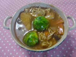 | ☆ 知人に芽キャベツをいただいたので、ハッシュドビーフならぬハッシュドチキンを作ってみました。雑誌を参考にしました。 これの良いのは、塊肉を買った時に ナイロン袋にたれを作り、その中に漬け込んでおくと食べる時に簡単に作れる事です。(ハヤシライスの素を買わなくても大丈夫です。) 芽キャベツを入れると、地味なシチューに緑が入り彩がきれいです。 |
