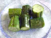 1.きゅうりを洗い、塩をすり込んで軽い重石1晩おく。 2.鍋にピクルス液の材料を入れ、強火でひと煮たちさせ、さます。 3.下漬けしたきゅうりの水気をふき取り、保存瓶のサイズに合わせて切る。 4.煮沸消毒した保存瓶にきゅうりを縦に入れ、冷めたピクルス液を注ぐ。(上右の写真) 5.蓋を閉め、2〜3日。味がしみたら出来上がり。 | |
