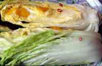 @.白菜の重さを量る。その4%の塩(60g)を計っておく。 A.白菜を1/4に割り、天気のいい日に天日で3〜4時間干す。(甘みが出る) B.白菜の軸の間に塩をぬる。昆布・柚子の皮・唐辛子・昆布茶の粉も入れて、重し(白菜の2倍以上の重さ)をする。 C.1日〜2日で水が上がる。 |