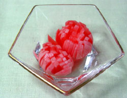 1.ラデッシュは下に割り箸を置いて(下まで切り離さないように)縦・横をこまかく切り、塩水につける。 2.ラデッシュがしんなりしたら、水気を切り甘酢に漬ける。 |