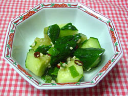 1.きゅうりは塩をふって板ずりし、すりこぎでたたいて、一口大に手で割る。