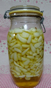 1.らっきょうの芽、根を切り切り落とし綺麗に洗う。 2.@のらっきょうをザルに入れ、全体に熱湯をかける。 3.甘酢を作る。酢と砂糖を鍋に入れて溶かす。沸騰させない 4.消毒した瓶にAのらっきょうを入れ、上からBの甘酢をかける。唐辛子と昆布茶も入れる。 (6月7日) |
