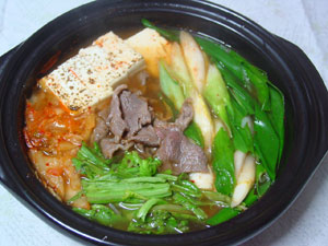 | 牛肉(すき焼き用)・・・80g ねぎ・・・3本 春菊・・・少々 焼き豆腐・・・半丁 (甘口)キムチ・・・50g 煮汁 しょうゆ・・・大さじ1 酒・・・1/4カップ 水・・・1.5カップ |