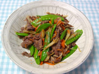 @.牛肉は食べやすい大きさに切り、調味料に漬けておく。 A.エンドウは筋を取る。人参は細い千切り。ごぼうはささがきにする。 B.フライパンに@と野菜を入れて混ぜ、蓋をして2〜3分したら出来上がり。 |