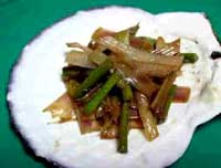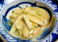 1.うどの皮をむいてじくを短冊に切り酢水につけて、30分程さらしてあく抜きをする。(酢水は水2.5Cに対して酢大さじ1) 2.@の水気を切り、酢味噌で和える。(白味噌50g、酢・砂糖各大さじ2)