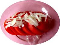 1.トマトは1cm位に切る。 2.玉ねぎはみじん切りにして、水にしばらくさらす。 3.冷やしたトマトに玉ねぎをのせ、ドレッシングをかける。 |