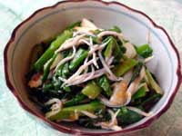 @. わけぎは白い根と葉に分け、3cm位に切る。 A. フライパンにサラダオイルを大さじ1を入れてわけぎの白いところを炒め、しんなりしてきたら緑の部分を入れてサッと炒めて取り出す。お皿に広げてうちわであおいで色止めをする。 B.酢味噌をつくり、その中にAとしんこを和える。 |