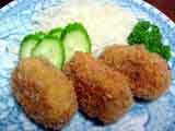 @.かぼちゃは種を取り除き蒸し、熱いうちにつぶしておく。外の皮も潰して入れる。 A.玉葱はみじん切りにして、バター大さじ1で透き通るまでフライパンで炒める。ミンチも加えて炒め、塩コショウする。 B.@とAを混ぜ、ナツメグをふり、適当な大きさに丸める。 C.小麦粉・溶き卵・パン粉の順にころもをつけ、きつね色に揚げる。 D.キャベツの千切りやきゅうりを添えて盛り付ける。 |