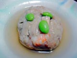 @.エビは殻つきのまま茹で、殻をむいて1cmくらいに切る。エリンギ・かまぼこも1cm角に切る。 A.れんこんはすりおろして塩・卵・片栗粉(大さじ2)を混ぜ@も混ぜ合わせる。 B.ラップでAを包み、茶巾しぼりにして強火の蒸し器で15分蒸し、それを器に移す。 C.鍋に調味液を入れて温め、水溶き片栗粉でとろみをつけ、あんを作ってBにかけ、枝豆と練りわさびをのせる。 |