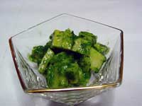 1.筍は1cmのさいの目切りにして、醤油と酒で薄味で下煮し、ざるにあげて水気をきる。ほうれん草は茹でて固く絞り、小さく刻んでおく。 2.イカは皮をむいて1cmのさいの目切りにして酒大さじ1と塩少々を入れて煮立ったらさっと入れて表面が白くなる程度に茹で、ざるに入れて冷ます。 3.木の芽みそは、ほうれん草・木の芽・調味料の順にすり鉢に入れてすり合わせる。 4.筍・イカの水気をきり、木の芽みそであえる。 |