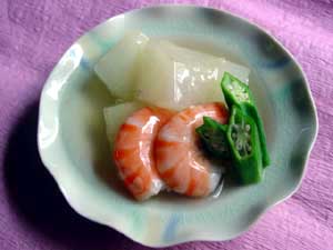 | 冬瓜・・・1/4個 海老・・・4ひき オクラ・・・4個 A だし汁・・・2カップ みりん・・・大さじ2 酒・・・大さじ2 淡口しょうゆ・・・大さじ1 塩・・・小さじ1/2 水溶き片栗粉・・・適宜 |
