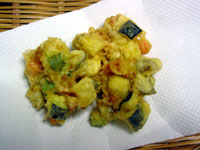 @.さつま芋はよく洗い皮つきのまま7mm角に切って水にさらす。他の野菜も7mm角に切る。野菜の水気をとり、小麦粉大さじ1をまぶす。 A.衣を作る。ボールに卵を溶き、冷水を加えてカップ1/2にする。小麦粉カップ1/2を加えさっくりと混ぜる。ここへ@を入れてさっくり混ぜる。 B.揚げ油を170℃に熱しAを大きめのスプーン等ですくいそっと落とす。 |