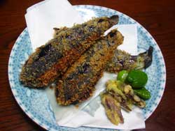 1.茄子は半分に切って、更にはさめるように切り目を入れ、水にさらして水けをきっておく。 2.玉ねぎはみじん切りにして、ひき肉・卵半個分・パン粉大さじ2・塩・こしょうとよく混ぜて@の茄子の間に等分にはさむ。 3.Aに小麦粉・卵水・パン粉の順にフライ衣をつけて油で揚げる。 4.ししとう・みょうが等冷蔵庫にある野菜を素揚げにしてそえる。 |
