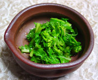 | 今日は3月3日ひな祭りです。ちょうどご近所から菜の花をいただきました。それでこれをつくりました。 菜の花は見ても食べても春を感じます。「ばら寿司・茶碗蒸し・菜の花のからしあえ」という献立でおひな祭りを楽しむ事も出来ました。 |