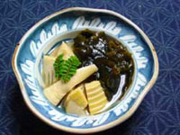1.茹でたたけのこは食べやすい大きさに切る。 2.ワカメは水でもどした後、2cmに切る。 3.鍋にだし汁と酒とたけのこを入れて5分ほど煮る。次に調味料を入れてことこと煮る。煮汁が1/3になったらワカメを入れてサッと煮る。 4.器に盛って木の芽をそえる。 |