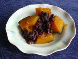 | ずーっと前にこの煮物は「おふくろの味」という本で見た事がありました。でも小豆を茹でるのに手間がかかるので作ったことがありませんでした。でも最近、蒸しあずき(砂糖味のないもの)が売られているのを知りました。 それを使って憧れの「小倉煮」を作ってみました。小豆をおかずとして食べるのは初めてです。なんきんもあずきも柔らかくて口の中でとろけるようです。ぜんざいになんきんを入れたような変わった組み合わせで、面白い煮物です。 |