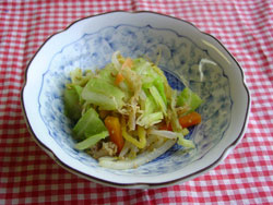 1.たくあんは千切り、するめは3cmに切る。 キャベツ・人参は短冊切りにする。 もやし・キャベツ・人参をゆがき水気を切り、よく絞る。 2.@を しょうゆ・ごまで和える。 |