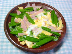 | 絹さやを近所からいただきました。初物です。田舎ならではの贅沢で、まずは卵とじです。 冷蔵庫にストックしていたハムも早く食べないと賞味期限が切れます。そこで、一緒に入れてみました。 緑と黄色の中にピンクも入って華やかになり、しかも旨みも出てまずまずでした。 (5月6日) |