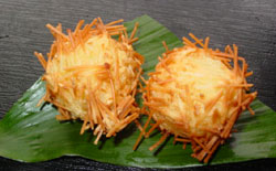 1.さつま芋は皮をむいて、2cmの輪切りにして柔らかくまるまでゆがき、すりこぎでつぶす。 2.素麺は1.5cm長さに折っておく。 3.@に砂糖、小麦粉、バターを加えてピンポン玉位の大きさに丸め、小麦粉、溶き卵、Aの素麺の順に衣をつけ、180度に熱した油で揚げる。 |