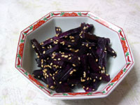 | 近所から紫のさつま芋をいただきました。よくお菓子で見かける芋です。 これできんぴらを作ってみました。色が鮮やかで、お菓子のようなおかずが出来ました。 |