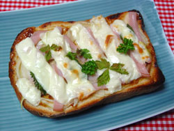 1.柚子味噌とマヨネーズを混ぜてパンに塗り、その上に玉ねぎ・ハム・チーズ・パセリ等をのせて、4〜5分焼く。