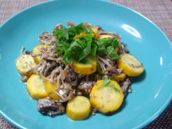 | 今が旬のズッキーニをオイル サーディンとで炒めました。 これにレモスコ(広島のお土産に頂いたものです)で味付けしてみました。 酸味と辛味がキリリときいて 大人の爽やかな味を楽しめました。 |