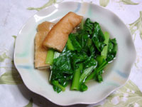 1.小松菜は3cmの長さに切る。油あげは熱湯で油ぬきをする。 2.だし汁を煮立て、そこへ油あげを入れ調味料を入れる。そこへ小松菜の茎から順に入れてサッと煮る。 |