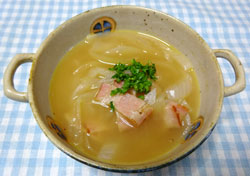 1.玉ねぎは1cmのくし型に切る。ベーコンは1cm幅に切る。パセリはみじん切りにする。 2.鍋にサラダ油を入れ、玉ねぎを炒める。しんなりしたらベーコンを加えて炒める。 3.Aに水とコンソメを入れ塩コショウで味をととのえる。煮立ったら火を止め、器に盛ってパセリを散らす。 |