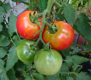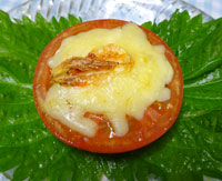 | 庭の小さな菜園でトマトを育てています。 何故かよく育って 毎日食べています。 甘酢で食べるのが多いのですが 今回はピザの様に チーズをのせて焼きました。 上にのせた桜えびが香ばしくて美味しいです。 |