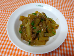 1.大根は食べやすい大きさに切っておく。 2.フライパンにサラダオイルを入れて、○を入れて香りがたったら挽肉を入れて炒め、肉の色が変わったら大根とネギも入れて2〜3分炒める。 3.そこに △の調味料を入れてフツフツしてきたら ◎を入れる。蓋をして10分程煮る。 4.大根がやわらかくなったら、水大2・片栗粉大1の水どき片栗粉でとろみをつけて 青ネギを散らす。 |