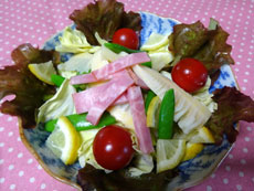 1.エンドウは筋を取って茹でておく。 2.キャベツやレタスは食べやすい大きさに千切っておく。 3.レモン薄切り2枚を食べやすい大きさに切る。ハムも薄切りにしておく。 4.皿に盛り付け、好みのドレッシングで食べる。 |