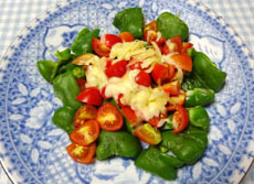 1.ピーマンは縦に切って種を取り、食べやすい大きさに切る。お皿に並べて塩・こしょうして、ラップをかけて2分レンジにかける。 2.トマトは1cmぐらいに切る。 3.@の上にトマトと とろけるチーズをのせて1分程レンジにかける。 |