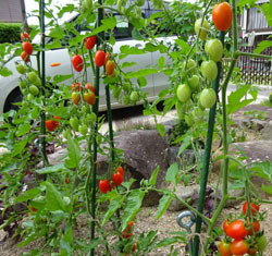トマトがよく採れるし、ピーマンも毎日1個2個と採れるのでそれらを使って火を使わない料理です。 味は塩コショウだけですが、チーズとトマトの酸味でピザのような感じです。 この暑さで菜園のオクラもキュウリもダウンしてますが、トマトの「あいこ」だけは 元気で次々実を付けてくれています。 |