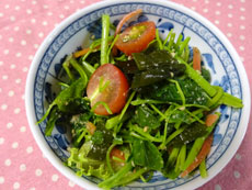 | 三つ葉・・・1つかみ 人参・・・5cm プチトマト・・・3〜4個 生ワカメ・・・30g すりゴマ・・・大2〜3 便利酢・・・大3 |
