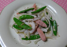 ☆ 家で取れたエンドウと新玉ねぎをソーセージを入れてソテーしました。黒コショウが効いています。