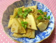 2.フライパンにサラダ油を入れて筍を1〜2分炒めてから調味料を入れ煮つめる。かつおを入れて ひと混ぜして 器に盛り付けて木の芽を散らす。