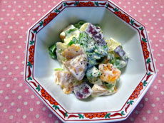 | さつま芋・・・100g 柿・・・1個 つまみ菜・・・適宜 調味料 プレーンヨーグルト・・・大2 マヨネーズ・・・大1 塩・・・少々 |