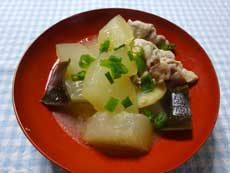 | 冬瓜・・・500g 豚肉・・・300g ショウガ・・・1片(うす切り) だし昆布・・・10cm 青ネギ・・・適宜 調味料 だし汁・・・3カップ 酒・・・大2 味噌・・・大2 砂糖・・・大1 |