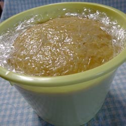 を 大きなナイロン袋に入れて熱いうちにつぶす。 (袋の上からビール瓶でつぶしました。) 2.塩と糀をしっかり混ぜる。 3.@とAをまんべんなく混ぜ合わせる。この時、大豆の煮汁を200cc程加える。すると、なめらかになり、混ぜやすくなります。 4.Bを野球ボールぐらいの大きさの味噌玉を空気が入らないようにハンバーグを作る要領で丸めて作る。 5.味噌玉を容器の底に叩きつけるように投げ入れ、空気が入らないように詰めていく。 6.詰め終わったら、容器の内側を乾いた布巾で拭き取り、ラップをかけ、空気に触れないようにする。 ★ 3月1日に作ったので、9月1日までは冷暗所に置き、ラップは取らないでねかせておく。 |