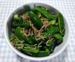 2.フライパンを熱してじゃこを炒る。そこへ@のピーマンを入れて炒め、水大1を加え、蓋をして弱火で1分蒸し煮にする。