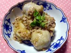 1.里芋は上下の端を切り落とし、皮に切り目を入れる。 2.耐熱皿に入れ、ラップをし、レンジで5分かけ、上下を返して更に3分かける。竹串がすつと通ればいいです。 3.ほんのり温かいうちに皮をむく。 4.鍋にゴマ油大1、ひき肉、しょうがを入れて2〜3分炒める。そこに里芋を入れて混ぜる。 5.そこへ、だし1カップ、しょうゆ、砂糖を入れる。落し蓋をして、更に蓋をして15分間煮る。 6.蓋をとって、3分ほど煮詰める。仕上げに、水どき片栗粉を入れてとろみをつける。 器に盛って 貝割れ菜をのせる。 |