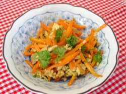 1.人参はマッチ棒ぐらいの千切りにする。 2.フライパンを熱し、サラダ油を入れて@の人参を柔らかくなるまで炒め、水気を切ったツナ缶を加え、塩・こしょう・だしの素で味付けをし、卵を溶いて入れ、入り卵風に仕上げる。 3.器に盛ってから千切ったパセリをのせる。 |