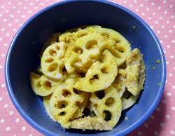 2.ボールに調味料を混ぜておく。そこに、@のれんこんを熱いうちに調味液に漬け込む。