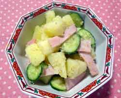 2,きゅうりは薄く切り、薄く塩をかけてから絞る。ハムは1cm幅に切る。