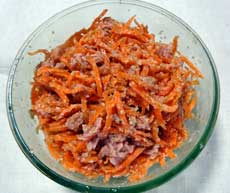 1.人参は千切りにして、耐熱容器に入れて、 1分レンジにかける。